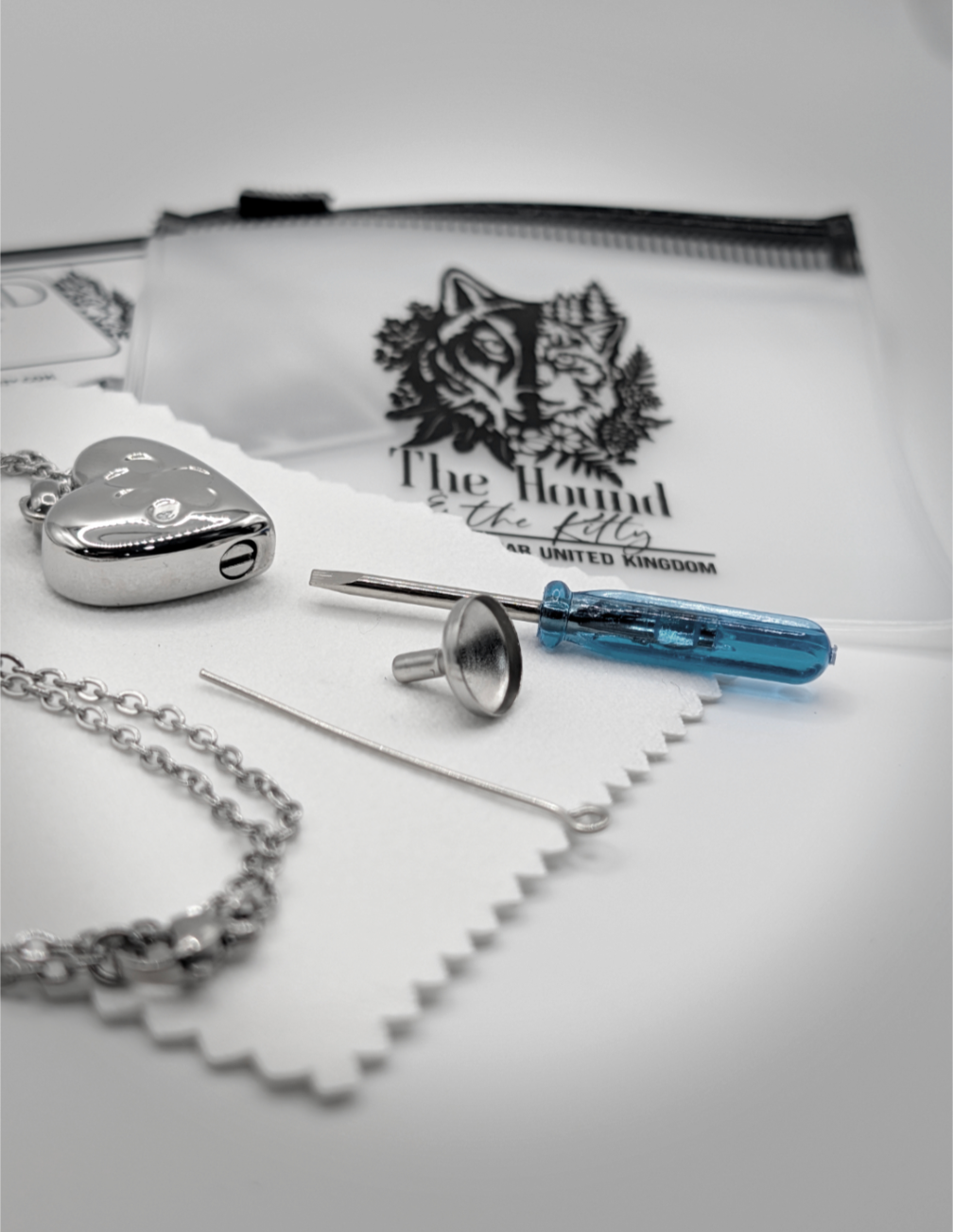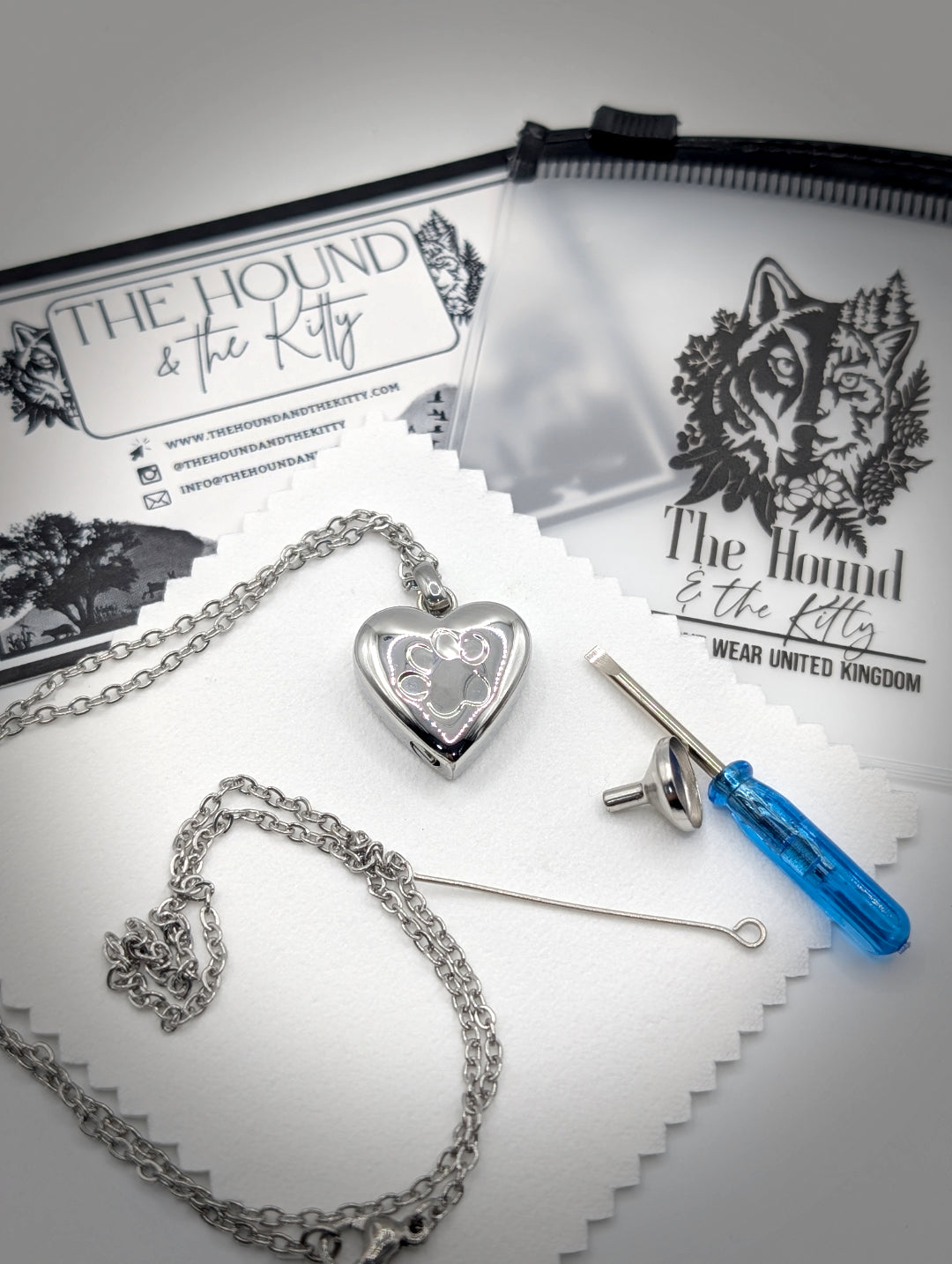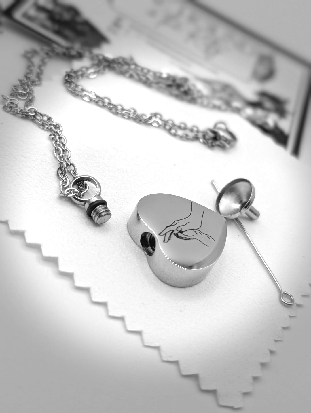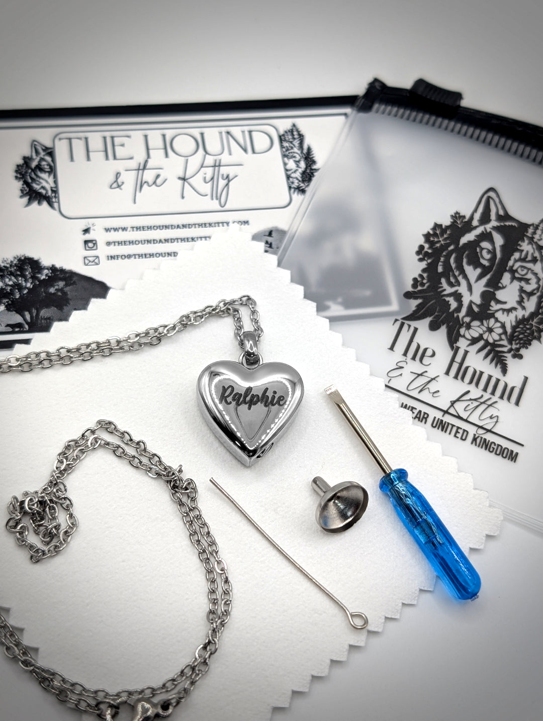 - 316L Stainless Steel urn pendants with necklace, free engraving and ashes tool kit (Custom size/shape on request info@thehoundandthekitty.com)